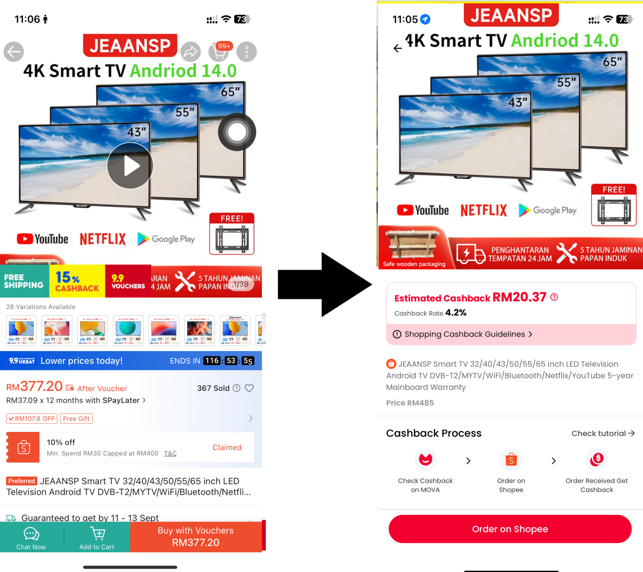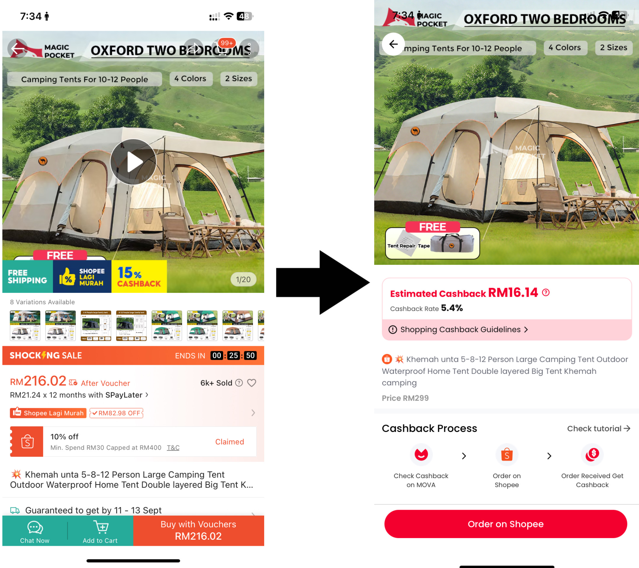 3. Klik "Order" dalam MOVA, terus Ke Shopee/TikTok untuk beli seperti biasa.